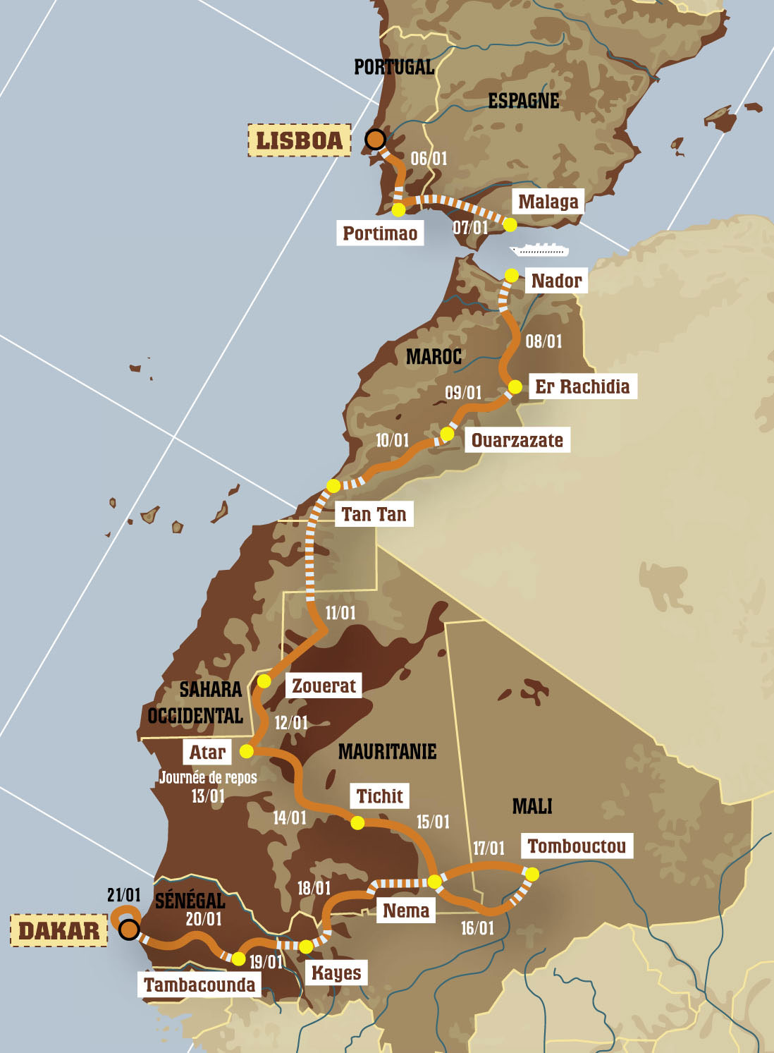 Hasta 2008, durante el tiempo que duraba la prueba, llevaba a los corredores desde alguna ciudad europea, hasta la ciudad de Dakar, Senegal. Durante muchos años partió de París, pero desde 1995 ha ido cambiando su lugar de inicio por otras ciudades europeas (Granada, Lisboa), fundamentalmente por motivos publicitarios o políticos, ya que la verdadera competición no comenzaba hasta que se entraba en el continente africano.A lo largo de la historia de esta competicion ha habido 3 Españoles que han ganado este Rallie. Los citados son: